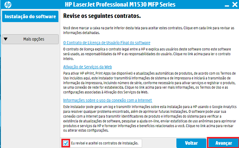 5º - Confirme a leitura dos termos de uso do software e clique em avançar.