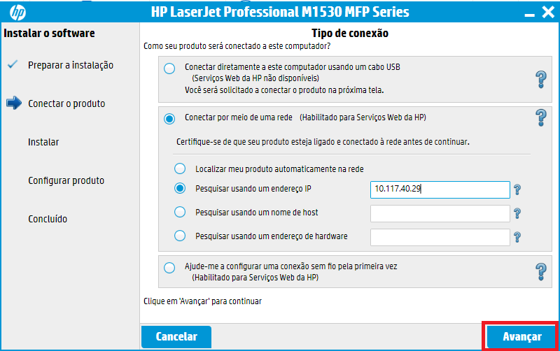 7º - Selecione conectar por meio de uma rede, em seguida a opção de pesquisar impressora por IP, insira o endereço a seguir: 10.117.40.29 e clique em avançar.