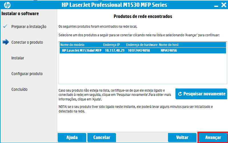 8º - Se a impressora for encontrada ela deve constar na lista, selecione a impressora e clique em avançar.