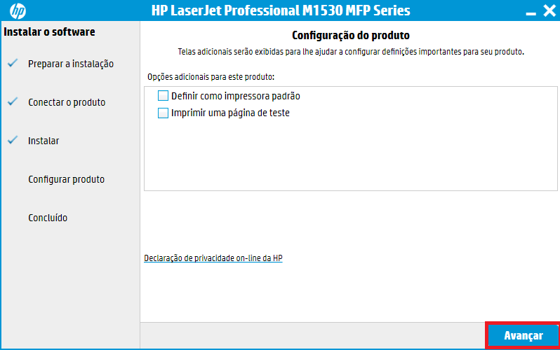 10º - Desmarque as o´ções de definir a impressora como padrão e imprimir página de teste e clique em avançar.
