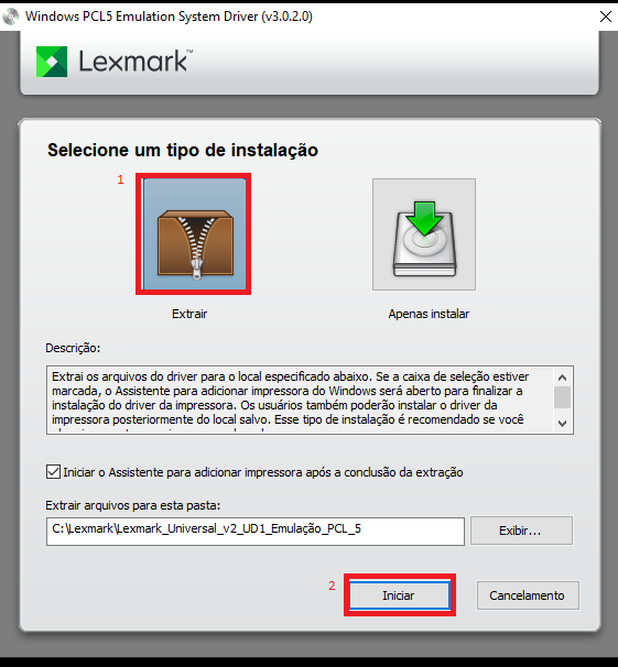 3º Selecione o tipo de instalação "Extrair", depois clique em "Iniciar";
